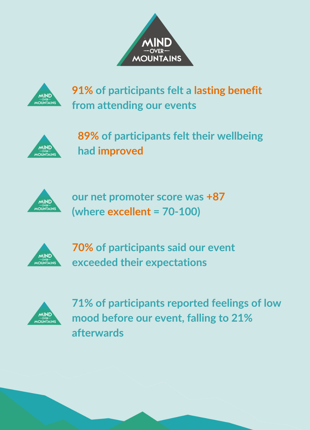 In 2023 that data showed the key outcomes in the graphic - of which we are immensely proud. In particular the lasting benefit of our mental wellbeing events.